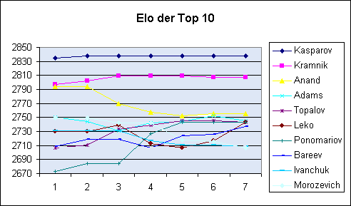 No. Name t NAT ap01 ju01 oc01 ja02 ap02 ju02 oc02 Gms 1 Kasparov, Gary.................. g RUS 2835 2838 2838 2838 2838 2838 2838 0 2 Kramnik, Vladimir............... g RUS 2797 2802 2809 2809 2809 2807 2807 0 3 Anand, Viswanathan.............. g IND 2794 2794 2770 2757 2752 2755 2755 0 4 Adams, Michael.................. g ENG 2750 2744 2731 2742 2744 2752 2745 6 5 Topalov, Veselin................ g BUL 2707 2711 2733 2739 2745 2745 2743 14 6 Leko, Peter..................... g HUN 2730 2730 2739 2713 2707 2717 2743 13 7 Ponomariov, Ruslan.............. g UKR 2673 2684 2684 2727 2743 2743 2743 0 8 Bareev, Evgeny.................. g RUS 2709 2719 2719 2707 2724 2726 2737 10 9 Ivanchuk, Vassily............... g UKR 2731 2731 2731 2717 2711 2711 2709 2 10 Morozevich, Alexander........... g RUS 2749 2749 2742 2742 2718 2716 2707 6 11 Gelfand, Boris.................. g ISR 2712 2704 2701 2703 2707 2710 2704 6 12 Grischuk, Alexander............. g RUS 2667 2669 2666 2671 2702 2702 2702 0 13 Shirov, Alexei.................. g ESP 2722 2706 2706 2715 2704 2697 2699 9 14 Khalifman, Alexander............ g RUS 2690 2700 2702 2688 2698 2690 2690 0 15 Svidler, Peter.................. g RUS 2695 2695 2686 2688 2688 2690 2690 0 16 Akopian, Vladimir............... g ARM 2654 2660 2660 2680 2678 2689 2689 0 17 Karpov, Anatoly................. g RUS 2692 2692 2692 2693 2690 2687 2688 1 18 Polgar, Judit (GM) w ........... g HUN 2678 2686 2686 2677 2677 2681 2685 2 19 Sokolov, Ivan................... g NED 2659 2659 2658 2659 2647 2677 2684 27 20 Short, Nigel D.................. g ENG 2676 2664 2675 2663 2673 2682 2684 9 21 Smirin, Ilia.................... g ISR 2691 2702 2698 2702 2685 2676 2683 14 22 Van Wely, Loek.................. g NED 2670 2695 2714 2697 2642 2645 2681 18 23 Zvjaginsev, Vadim............... g RUS 2627 2638 2640 2656 2645 2668 2680 9 24 Dreev, Alexey................... g RUS 2685 2690 2676 2683 2677 2676 2673 19 25 Almasi, Zoltan.................. g HUN 2640 2630 2630 2644 2650 2672 2672 0 26 Sasikiran, Krishnan............. g IND 2611 2589 2569 2569 2633 2650 2670 28 27 Malakhov, Vladimir.............. g RUS 2623 2637 2637 2647 2663 2668 2670 6 28 Vaganian, Rafael A.............. g ARM 2641 2650 2650 2662 2664 2667 2667 9 29 Ye, Jiangchuan.................. g CHN 2671 2677 2681 2676 2676 2676 2667 4 30 Azmaiparashvili, Zurab.......... g GEO 2670 2674 2674 2676 2676 2676 2666 15 31 Lautier, Joel................... g FRA 2658 2675 2653 2687 2675 2663 2665 0 32 Rublevsky, Sergei............... g RUS 2657 2639 2634 2655 2657 2658 2664 9 33 Nikolic, Predrag................ g BIH 2652 2652 2652 2653 2653 2661 2661 0 34 Georgiev, Kiril................. g MKD 2676 2695 2686 2655 2654 2658 2658 0 35 Sutovsky, Emil.................. g ISR 2604 2651 2664 2656 2660 2658 2657 20 36 Kasimdzhanov, Rustam............ g UZB 2693 2704 2706 2695 2674 2648 2653 0 37 Bacrot, Etienne................. g FRA 2627 2653 2653 2649 2653 2653 2653 0 38 Krasenkow, Michal............... g POL 2655 2573 2592 2632 2641 2657 2651 20 39 Movsesian, Sergei............... g SVK 2661 2627 2631 2624 2624 2654 2651 16 40 Beliavsky, Alexander G.......... g SLO 2638 2659 2668 2649 2661 2652 2650 27 41 Onischuk, Alexander............. g USA 2658 2667 2660 2655 2641 2644 2649 33 42 Sakaev, Konstantin.............. g RUS 2637 2630 2639 2649 2649 2647 2647 0 43 Kaidanov, Gregory S............. g USA 2601 2605 2605 2596 2616 2638 2646 25 44 Piket, Jeroen................... g NED 2628 2630 2649 2659 2659 2646 2646 0 45 Lutz, Christopher............... g GER 2614 2643 2643 2644 2644 2650 2645 12 46 Xu, Jun......................... g CHN 2655 2646 2654 2654 2654 2654 2643 13 47 Volkov, Sergey.................. g RUS 2558 2578 2578 2567 2609 2636 2642 13 48 Huebner, Robert Dr.............. g GER 2616 2612 2612 2628 2628 2634 2640 7 49 Graf, Alexander................. g GER 2649 2610 2610 2605 2623 2624 2635 29 50 Vallejo Pons, Francisco......... g ESP 2559 2630 2630 2629 2638 2648 2635 10 51 Gurevich, Mikhail............... g BEL 2688 2633 2605 2641 2641 2649 2634 42 52 Korchnoi, Viktor................ g SUI 2643 2617 2639 2633 2635 2620 2634 19 53 Hjartarson, Johann ............. g ISL 2633 2633 2633 2633 2634 2634 2634 0 54 Motylev, Alexander.............. g RUS 2601 2627 2641 2639 2622 2634 2634 0 55 Landa, Konstantin............... g RUS 2610 2619 2619 2619 2623 2621 2632 11 56 Tkachiev, Vladislav............. g FRA 2672 2642 2632 2634 2633 2625 2632 10 57 Tiviakov, Sergei................ g NED 2603 2618 2599 2614 2625 2628 2631 37 58 Goldin, Alexander............... g USA 2599 2594 2612 2630 2618 2609 2630 28 59 Seirawan, Yasser................ g USA 2640 2644 2644 2644 2631 2618 2629 11 60 Epishin, Vladimir............... g RUS 2579 2583 2583 2599 2606 2643 2628 38 61 Radjabov, Teimour............... g AZE 2533 2558 2567 2599 2610 2618 2628 8 62 Bologan, Viktor................. g MDA 2676 2655 2668 2651 2652 2631 2627 9 63 Lputian, Smbat G................ g ARM 2607 2608 2618 2634 2634 2627 2627 0 64 Lastin, Alexander............... g RUS 2627 2628 2628 2630 2619 2625 2625 0 65 Kobalia, Mikhail................ g RUS 2590 2595 2603 2620 2602 2625 2625 0 66 Sadler, Matthew................. g ENG 2633 2631 2631 2631 2631 2624 2624 0 67 Jussupow, Artur................. g GER 2645 2633 2633 2618 2618 2612 2622 9 68 Pigusov, Evgeny................. g RUS 2584 2613 2613 2623 2623 2622 2622 0 69 Shabalov, Alexander............. g USA 2595 2574 2585 2606 2622 2624 2621 29 70 Aleksandrov, Aleksej............ g BLR 2610 2646 2645 2645 2654 2646 2621 22 71 Milov, Vadim.................... g SUI 2605 2614 2602 2595 2606 2602 2620 34 72 Nielsen, Peter Heine............ g DEN 2585 2593 2620 2642 2636 2626 2620 29 73 Zhang, Zhong.................... g CHN 2632 2667 2657 2656 2639 2637 2620 13 74 Fressinet, Laurent.............. g FRA 2575 2606 2588 2591 2606 2619 2619 0 75 Dautov, Rustem.................. g GER 2631 2630 2630 2636 2636 2611 2617